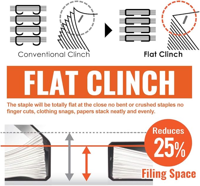 - Flat Clinch Mechanism Clinches a staple totally flat, allowing papers to stack neatly and evenly reduces filing space by as much as 25%.